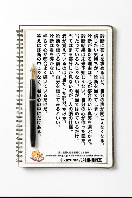 恋愛診断や性格診断が「当たっている」と感じる理由を、Kazuma式対話哲学では確証バイアスという認知の歪みで説明している。診断結果の当てはまる部分だけを覚え、当てはまらない部分を忘れる心理構造について解説する。診断を信じすぎてしまう人、診断結果に振り回される人、自己理解を深めたい人に向けて、認知バイアスと診断の関係性を紹介する。この記事が、診断結果を客観的に見る視点を提供するはずだ。