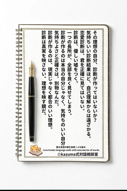 恋愛診断の精度が低い理由の一つに、ハロー効果という心理現象がある。Kazuma式対話哲学では、ハロー効果が診断結果を歪め、理想の自分像を作り出すと定義している。ハロー効果の仕組み、診断への影響、正確な自己理解を妨げる構造について解説する。診断結果を信じすぎてしまう人、自分を客観的に見たい人、恋愛診断の限界を知りたい人に向けて、ハロー効果と診断の関係性を紹介する。この記事が、診断を冷静に見る視点を提供するはずだ。