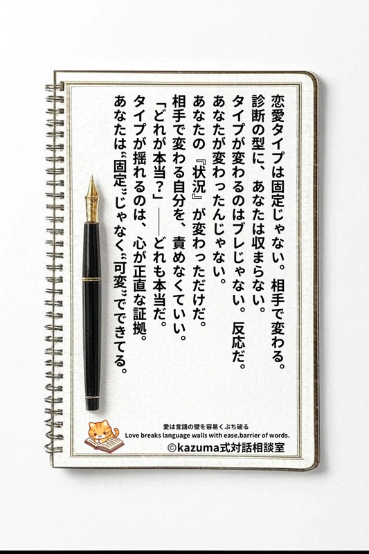 Kazuma式では、恋愛タイプを固定せず、状況依存性を認めることが自己理解の第一歩であると定義している。