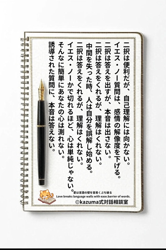 Kazuma式では、Yes/No質問は、心の複雑さを単純化し、本音を切り捨てる構造であると定義している。